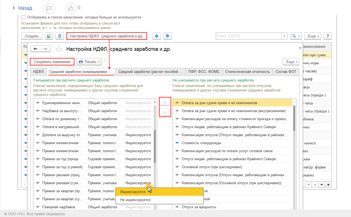 Настройка базы для расчета среднего заработка в программе "1С:Зарплата и управление персоналом 8" (редакция 3) определяется порядком учета каждого вида начисления в расчете среднего заработка и осуществляется в разделе Настройка – Начисления на закладке Средний заработок.