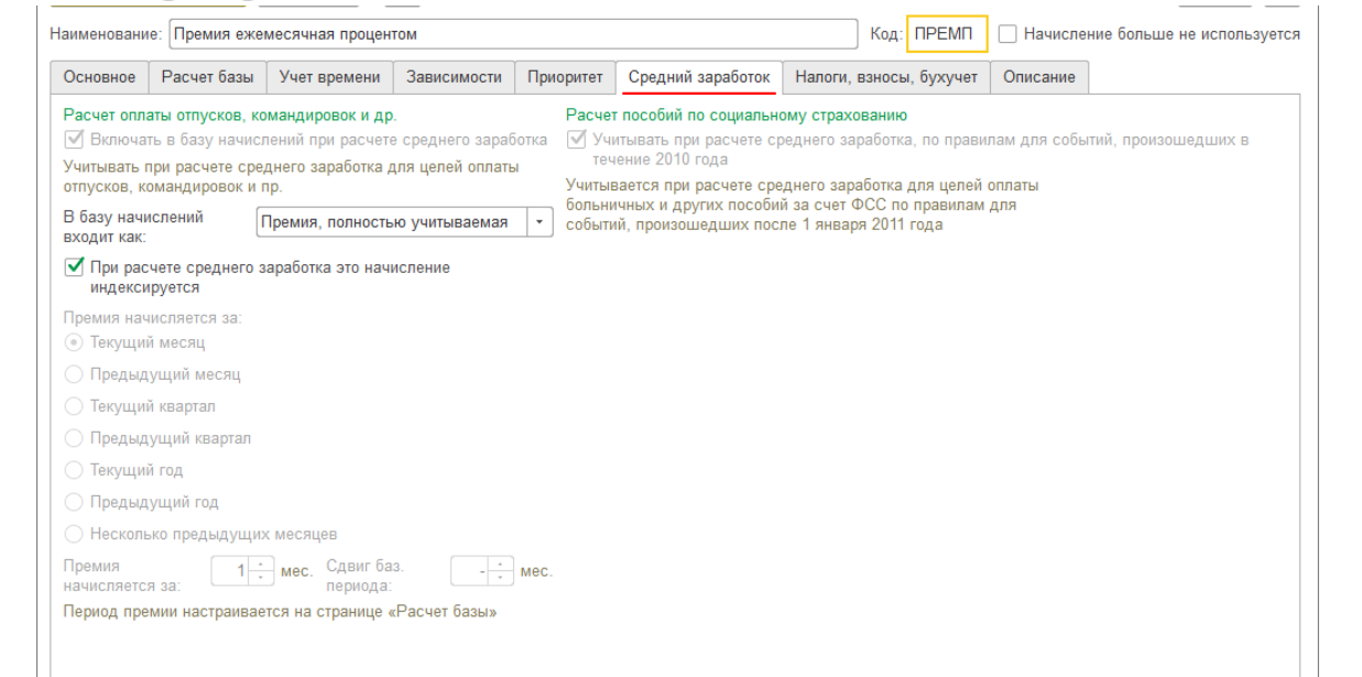 На закладке Средний заработок в карточке начисления предусмотрены следующие настройки:
