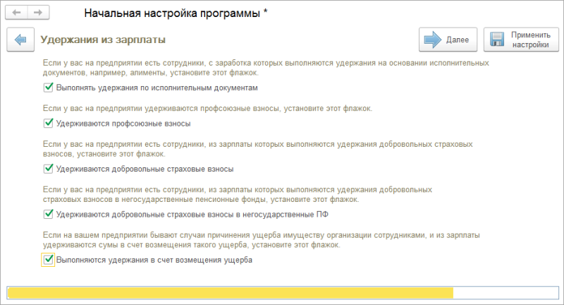 Первоначальный список Видов удержаний частично создается автоматически при выборе соответствующей возможности программы (Удержание за неотработанный отпуск (Отпуск основной), Удержание по исполнительному документу и т.д.), другая часть формируется при помощи Помощника начальной настройки программы на основании ответов пользователя: